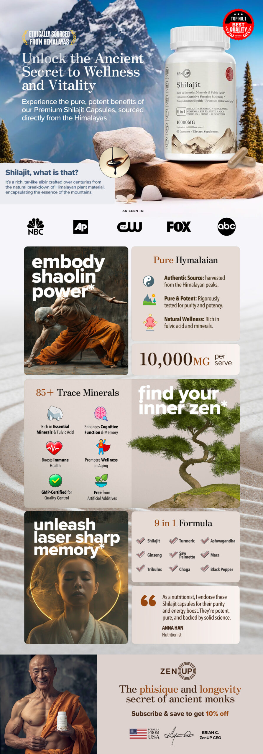 - Premium Quality Formula: With a 9 in 1 formula contains 10,000mg of Shilajit extract per serving, that includes Shilajit, Turmeric, Ashwagandha, Ginseng, Saw Palmetto, Maca, Tribulus, Chaga, and Black Pepper for comprehensive support. ZenUP Shilajit is an excellent choice for those seeking to support overall health and wellness.
